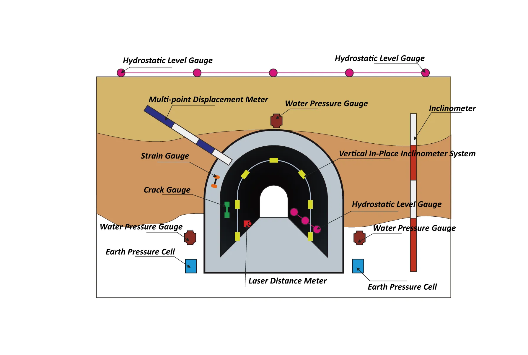 გვირაბის დასახლება, კონვერგენციის მონიტორინგი, გვირაბის ბზარი, სტრუქტურული დაძაბვის მონიტორინგი და ა.შ.